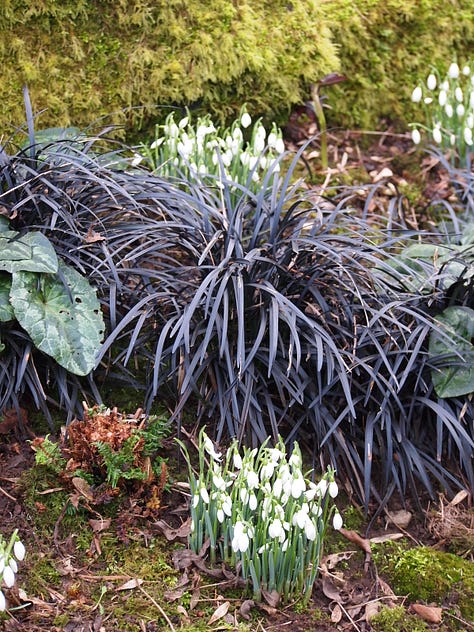 My solution was to try and create something like a woodland rockery, woodland plants in a rockery setting, as though as the woodland had naturalised a pile of boulders along its margin. I also had the start of a colour theme. We inherited an amazing almost black Hellebore, the black grass Ophiopogon planiscapus Nigrescens and some lime green Euphorbia amygdaloides var. Robbiae, so the idea of blacks, dark purples, contrasting with lime greens became something of a colour palette, complemented with rosy pinks and mid green foliage.
