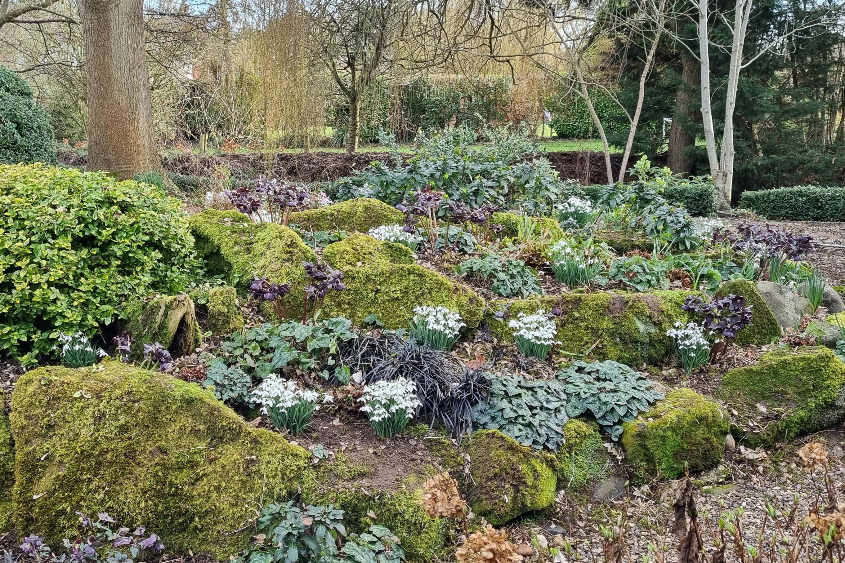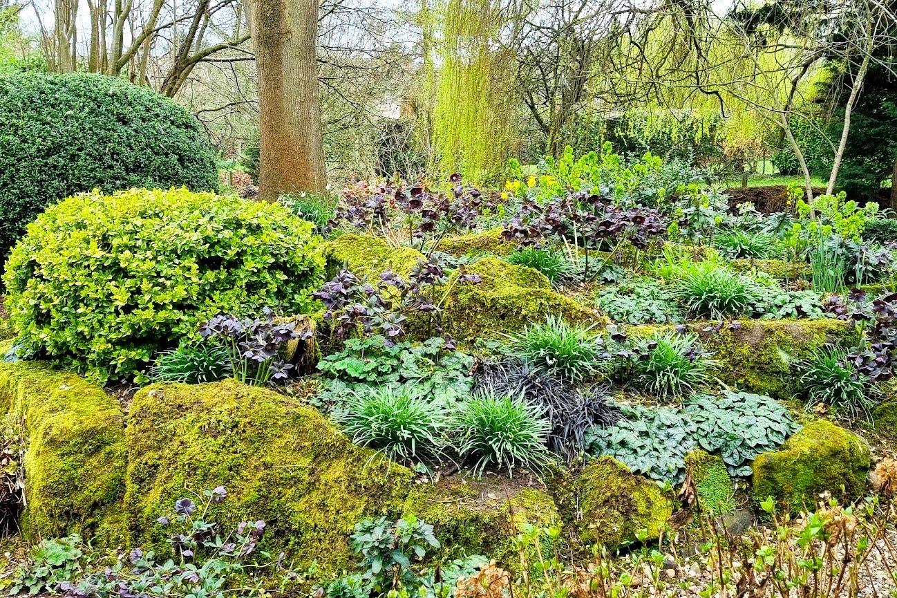 My favourite time for the Woodland Rockery is March, when the deep purple hellebores are in full swing, and the euphorbia creates a vivid lime splash as a contrast. The leaves are not back on the trees yet, so it’s not quite so shady.