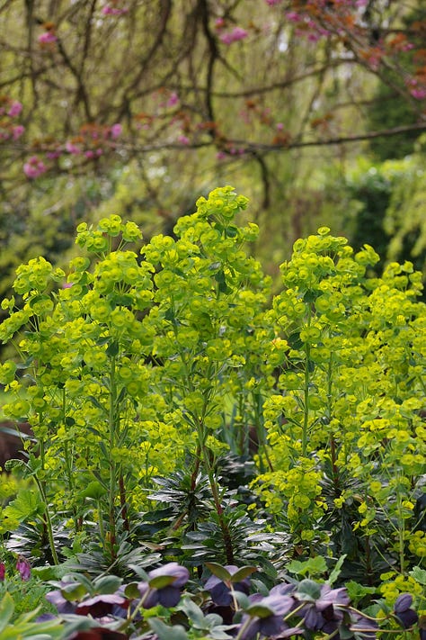 Euphorbia amygdaloides var. Robbiae (can spread and wander around the border)